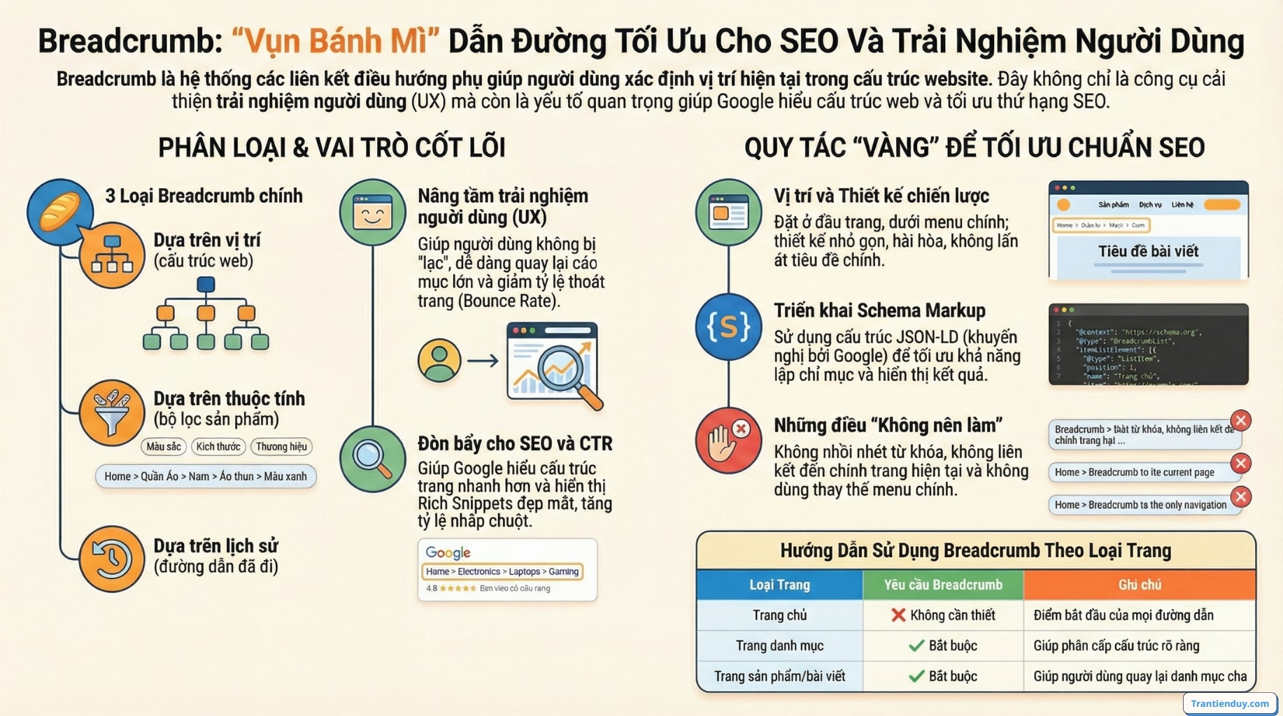Theo kinh nghiệm triển khai của Trần Tiến Duy, breadcrumb là một trong những tối ưu nhỏ nhưng tác động lớn: nó giúp người dùng đỡ lạc, giúp bot hiểu cấu trúc nhanh, và quan trọng nhất là làm sạch tín hiệu phân cấp nội dung để hỗ trợ SEO bền vững.