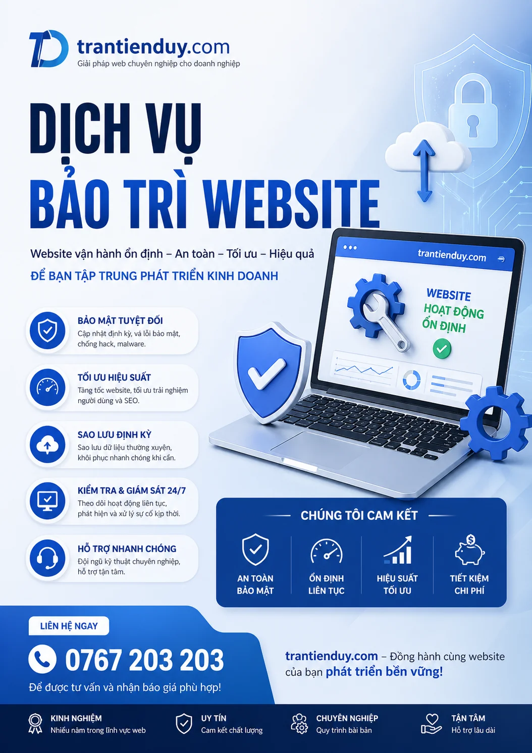 Tại Trantienduy.com, chúng tôi hiểu bảo trì website không chỉ là “sửa lỗi”, mà là một hệ thống giải pháp toàn diện giúp website của bạn luôn: